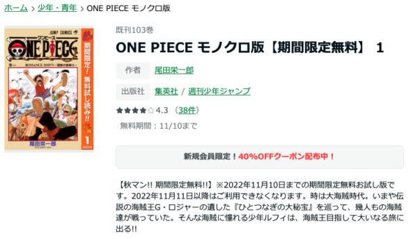 人気の作品でも、「1巻のみ無料」といったタイトルが非常に多くあります。試し読み目的でとりあえず新規登録してみてはいかがでしょうか?