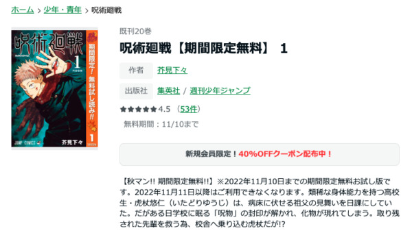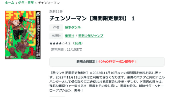 試しに1巻読んでみてどんなマンガがあるか知りたい人。また新規登録の場合は100冊まで40%オフのキャンペーンがあるので、新規にネットでマンガを読みたい人にオススメです。