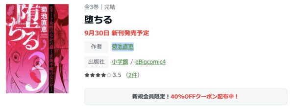 Amebaマンガでは全巻無料ではありませんが、登録時にもらえるクーポンを利用してすぐに「堕ちる」を40%オフで読むことができます。